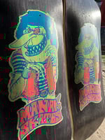 10.5” wide, 32.” long, 14” wheelbase, 7” nose, 6.75” tail. Short and stubby popsicle for tearing up the streets and has massive concave! Hand screen-printed 3 color graphic on bottom and logo printed on top. Two dyed veneer (orange top, black bottom). 2 made. Don't sleep, these will be very rare.