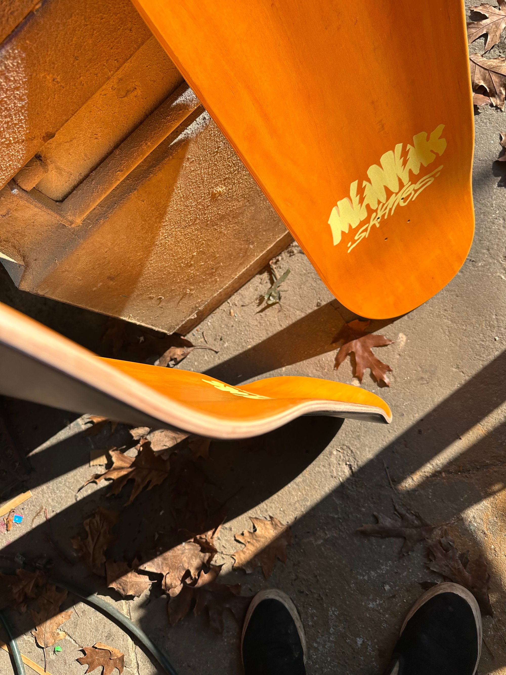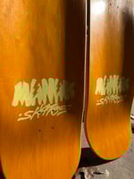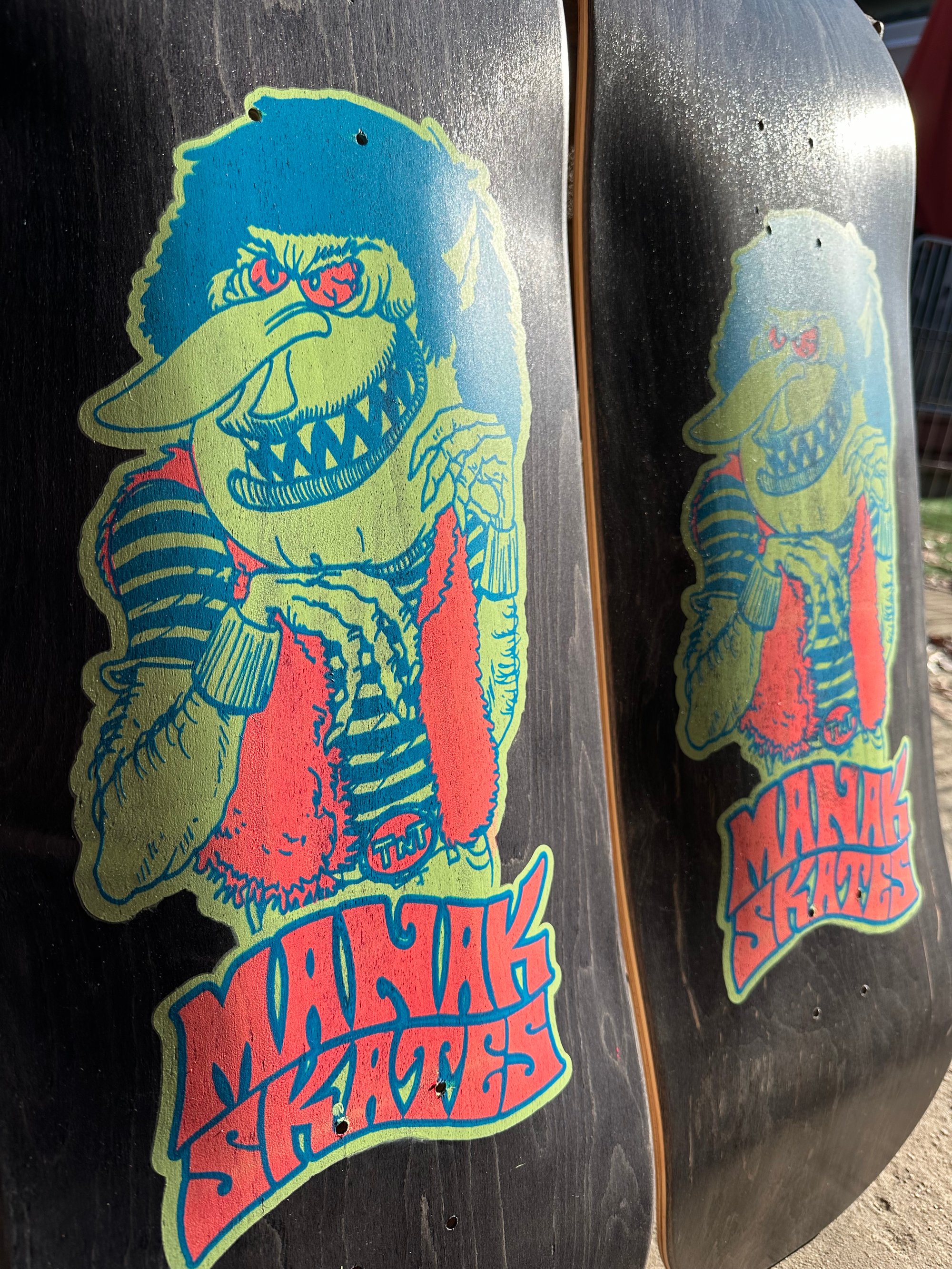 All decks are hand glued, cold pressed, shaped, painted, screen-printed, glossed, and shrink wrapped one at a time by the Manak family in our backyard in San Jose, Ca. We only use the finest North American Hard Rock Maple. We add extra press time and cure times to make a higher quality, better performing deck. Hand-glued leads to a stiffer, longer-lasting board with everlasting pop. In most cases, our boards will last much longer than a factory-made deck. Low tech, no tech! 🤙