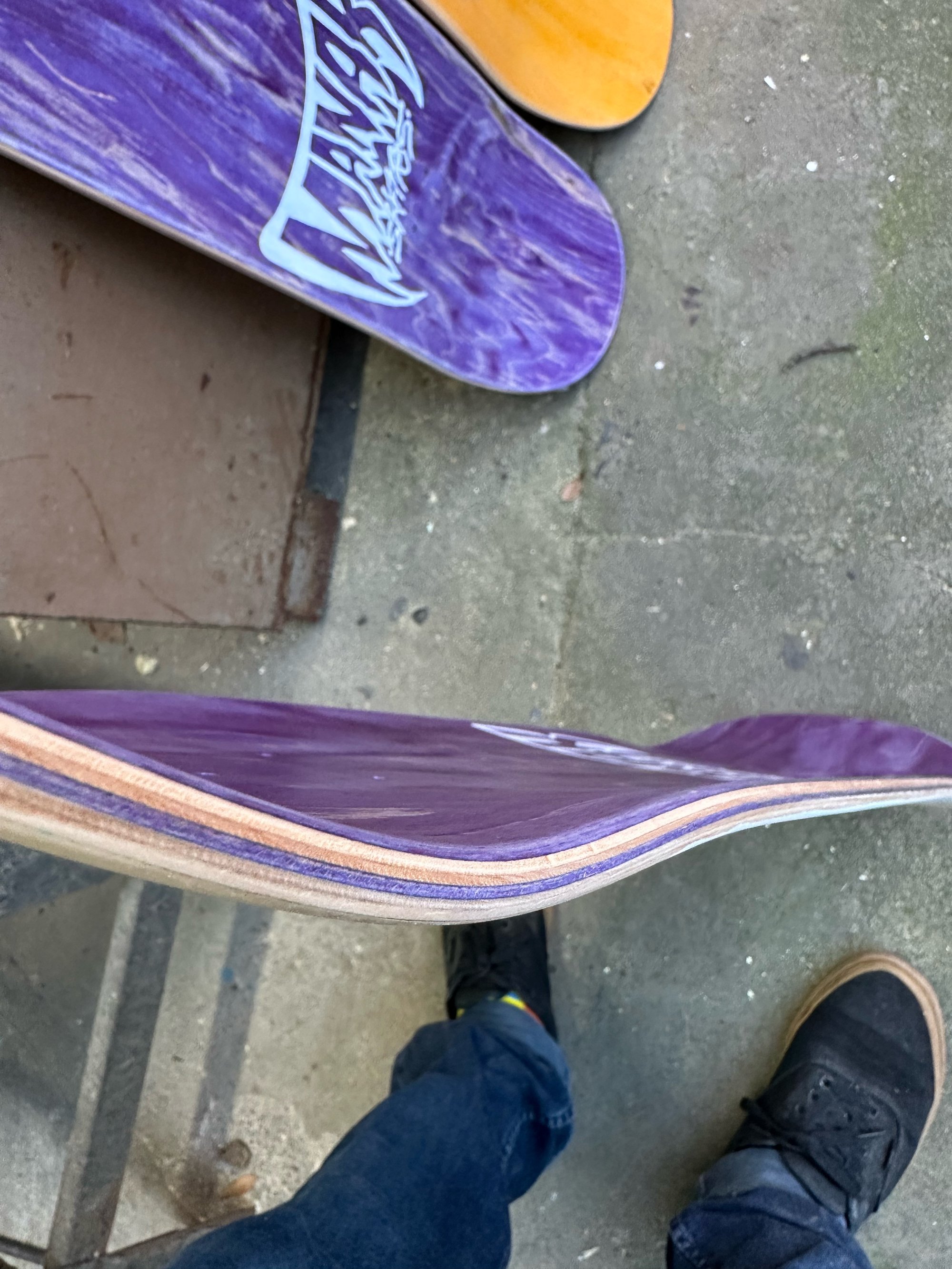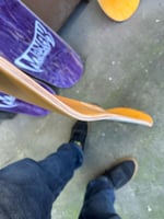 8.5” wide, 31.875" long, 14.25” wheelbase, 6.75” nose/tail, symmetrical twin tail full shape popsicle. The nose is one degree steeper than the tail. Two options (purple top/center ply or orange top and bottom ply), painted white on the belly, hand screen printed graphic on the top and bottom. Medium/Heavy concave. 3 made.