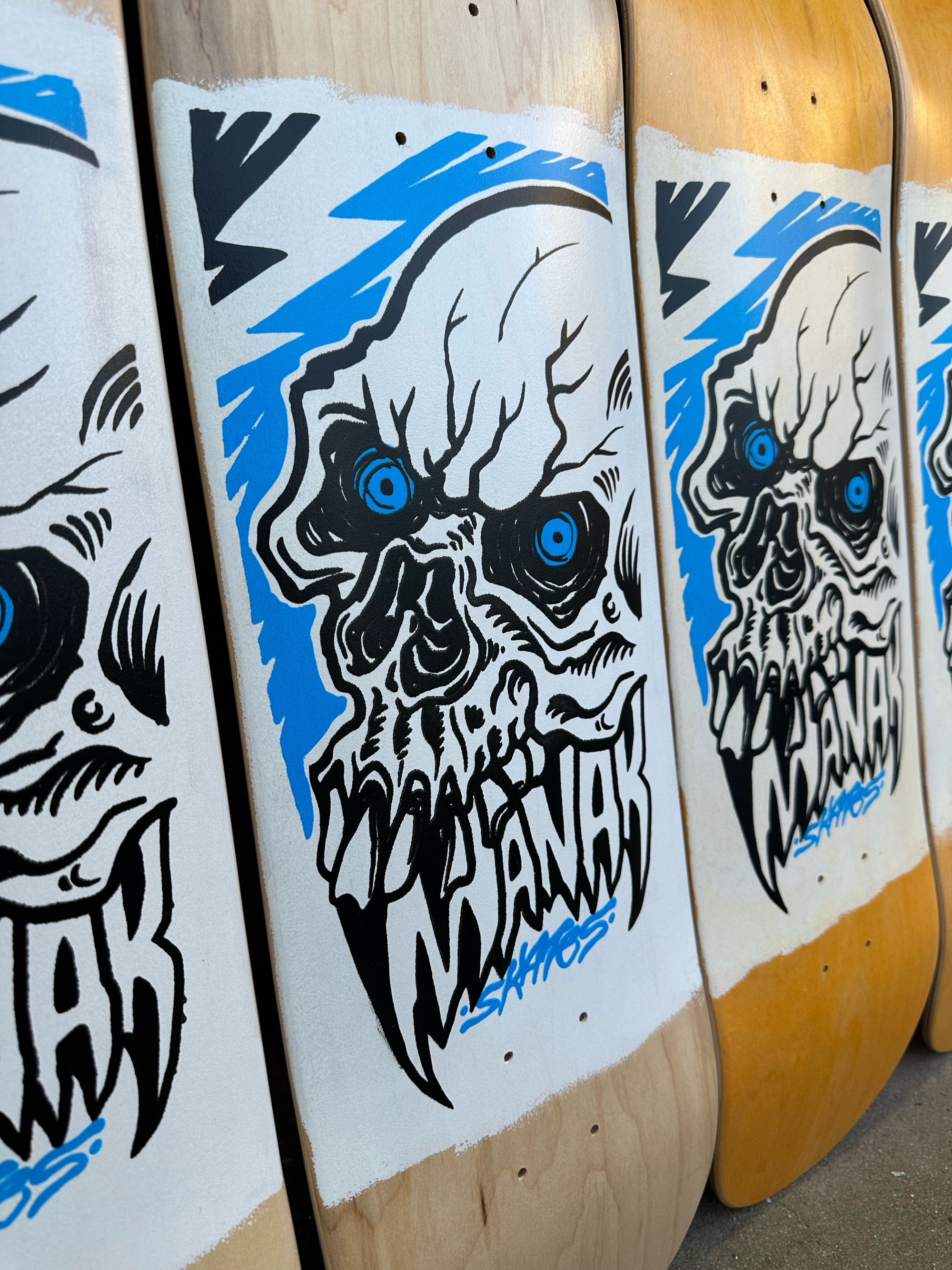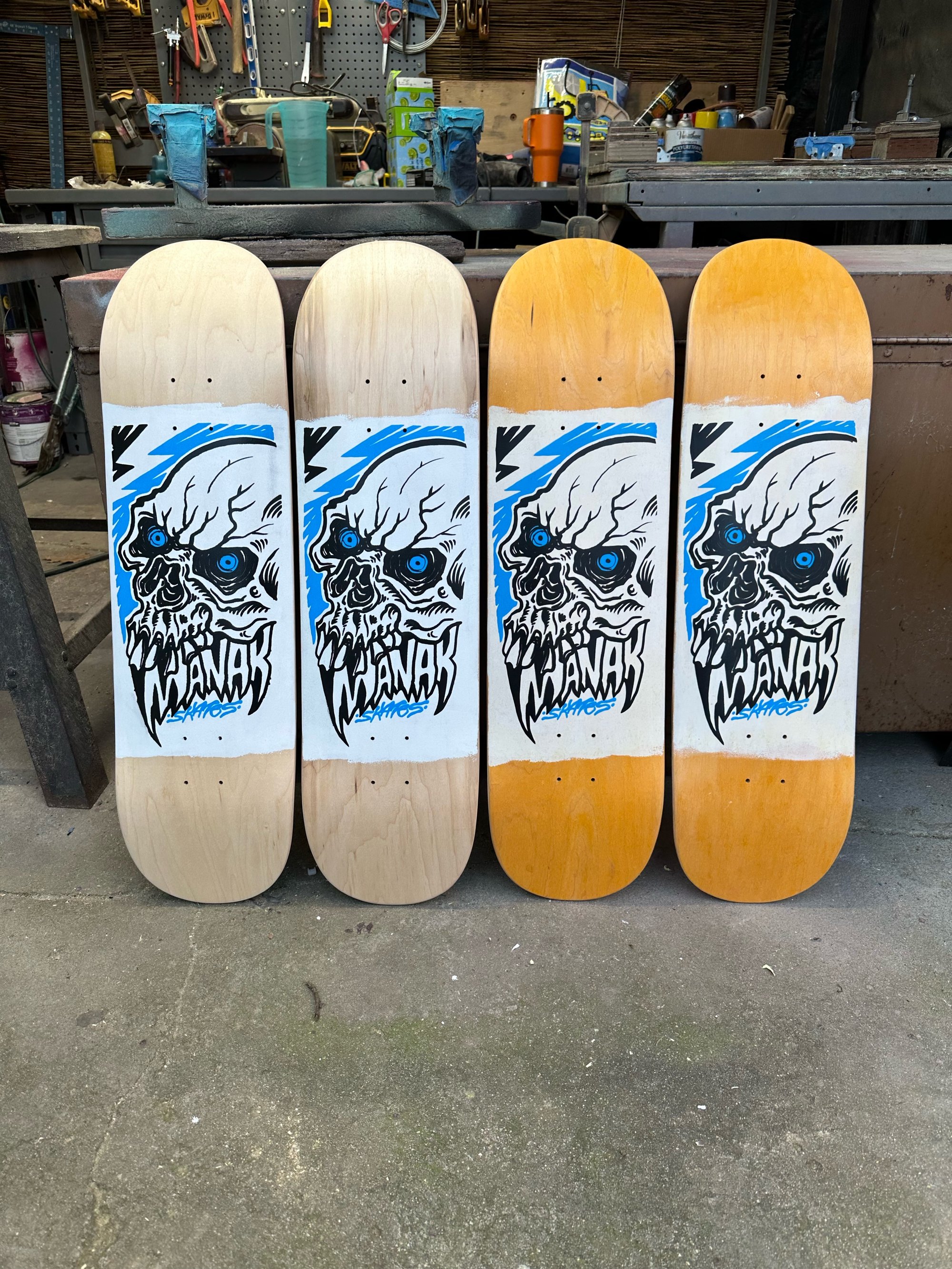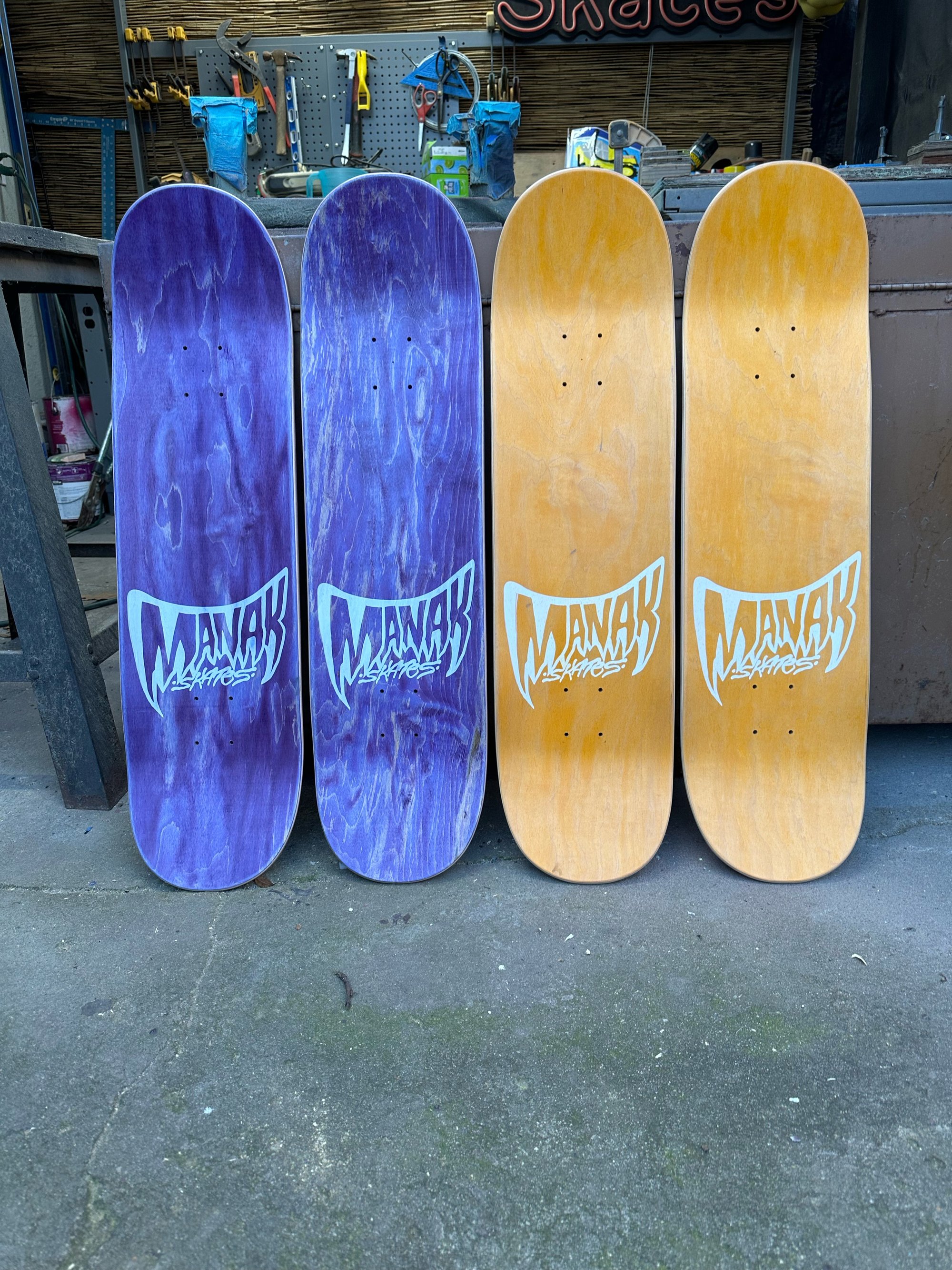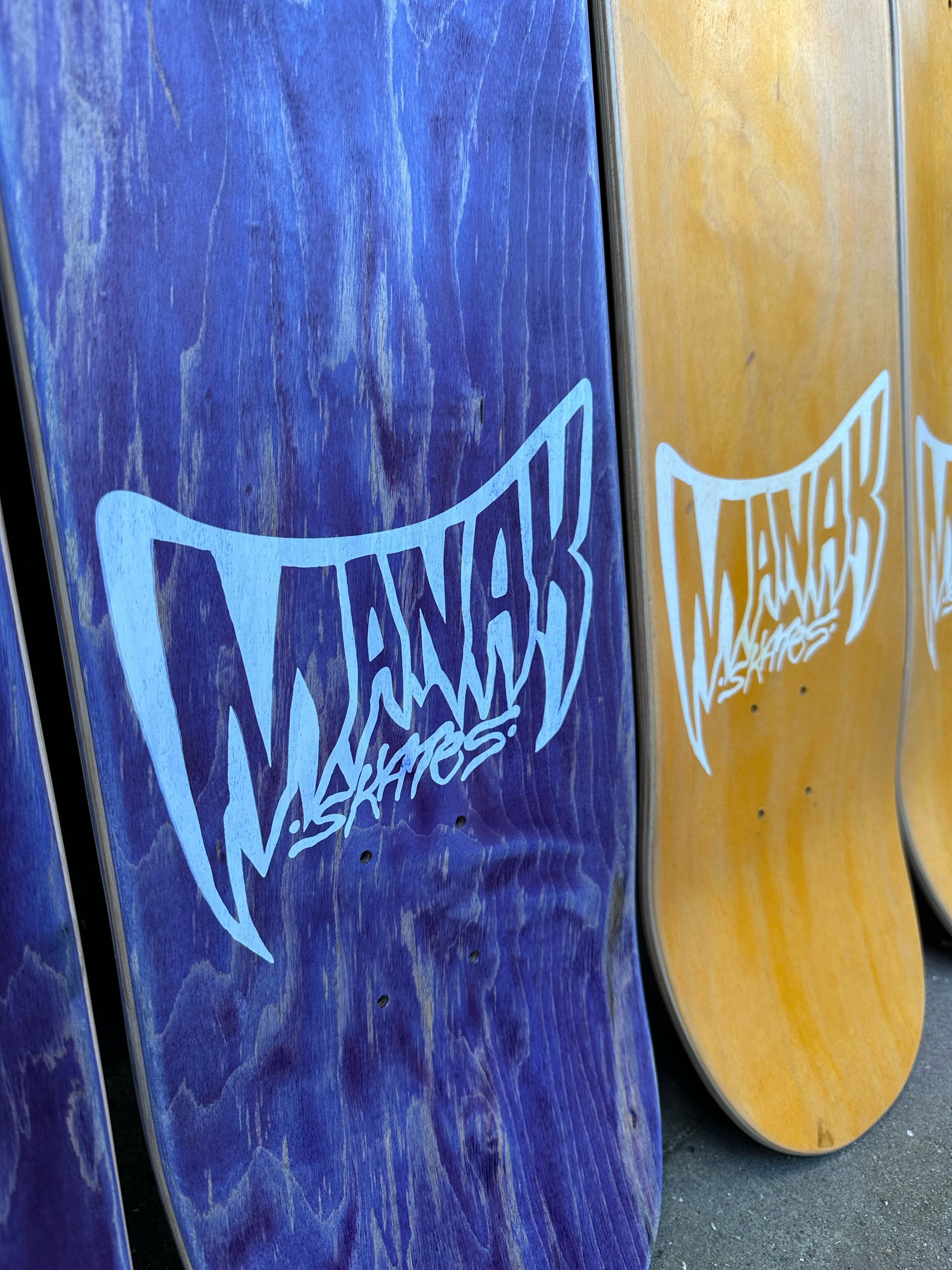All decks are hand glued, cold pressed, shaped, painted, screen-printed, glossed, and shrinkwrapped one at a time by the Manak family in our backyard in San Jose, Ca. We only use the finest North American Hard Rock Maple. We add extra press time and cure times to make a higher quality, better performing deck. Hand-glued leads to a stiffer, longer-lasting board with everlasting pop. In most cases, our boards will last much longer than a factory-made deck. Low tech, no tech! 🤙