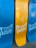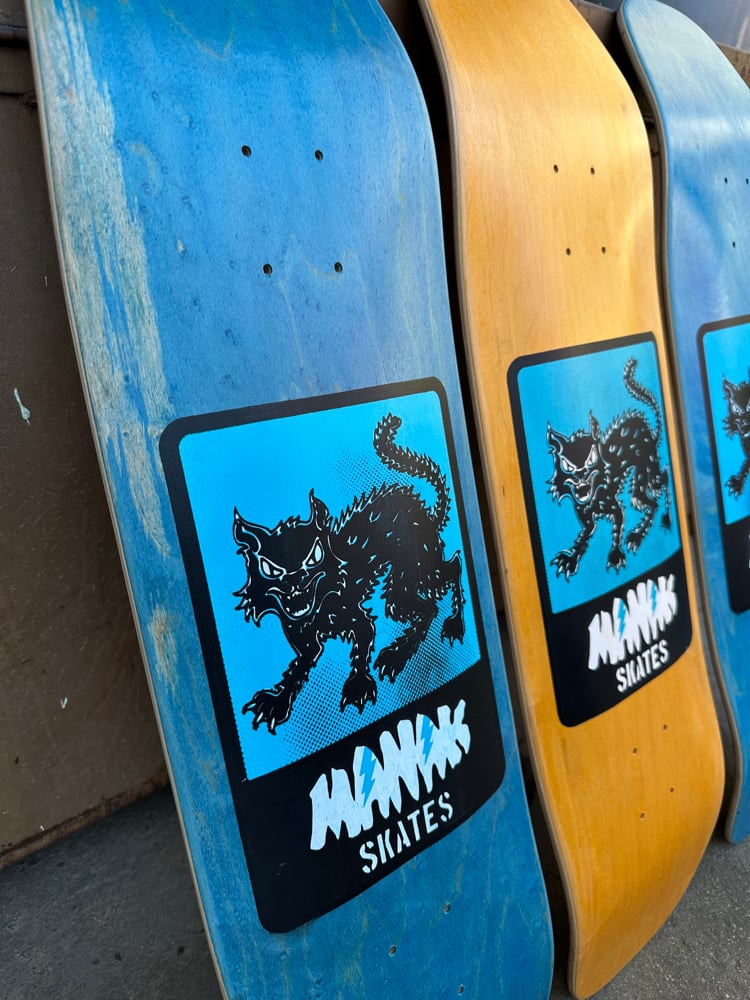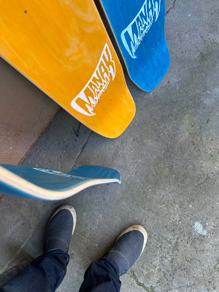 All decks are hand glued, cold pressed, shaped, painted, screen-printed, glossed, and shrink-wrapped one at a time by the Manak family in our backyard in San Jose, Ca. We only use the finest North American Hard Rock Maple. We add extra press time and cure times to make a higher quality, better performing deck. Hand-glued leads to a stiffer, longer-lasting board with everlasting pop. In most cases, our boards will last much longer than a factory-made deck. Low tech, no tech! 🤙