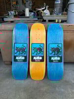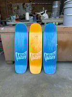8.75” wide, 32" long, 14.25” wheelbase, 7” nose, 6.75” tail, slight taper. 3 color hand screen-printed bottom graphic, 1 color logo printed on top. Two dyed veneer on top and bottom. Two made. Medium/heavy concave.