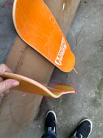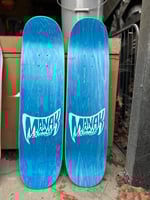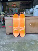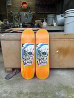 8.75” wide, 32.875” long, 14.75” wheelbase, 7.125” nose, 6.875” tail, no taper. 3 color hand screen-printed graphics on bottom and logo printed on top. Dyed veneer on top and bottom (blue and orange). 2 of each color made. Medium/Heavy Concave.