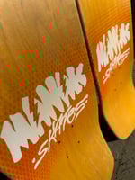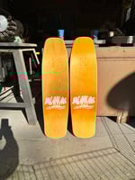 9.125” wide, 32.5” long, 6.375” nose, 7” tail, 15” wheelbase. Orange sprayed honeycomb accents, screenprinted top and bottom graphics. Two orange dyed veneer on top and bottom. Two made. Medium/heavy concave.