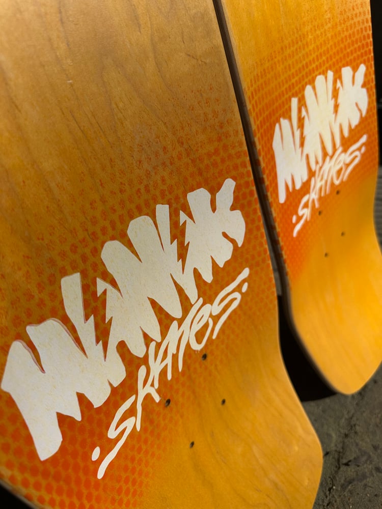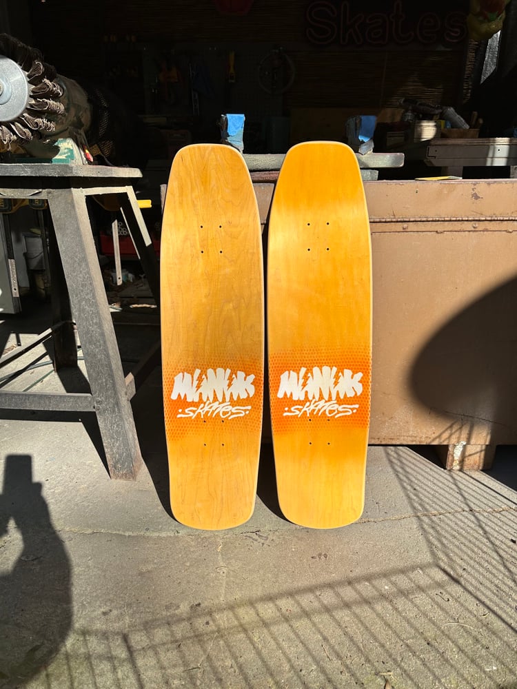 All decks are hand glued, cold pressed, shaped, painted, screen-printed, glossed, and shrinkwrapped one at a time by the Manak family in our backyard in San Jose, Ca. We only use the finest North American Hard Rock Maple. We add extra press time and cure times to make a higher quality, better performing deck. Hand-glued leads to a stiffer, longer-lasting board with everlasting pop. In most cases, our boards will last much longer than a factory-made deck. Low tech, no tech! 🤙