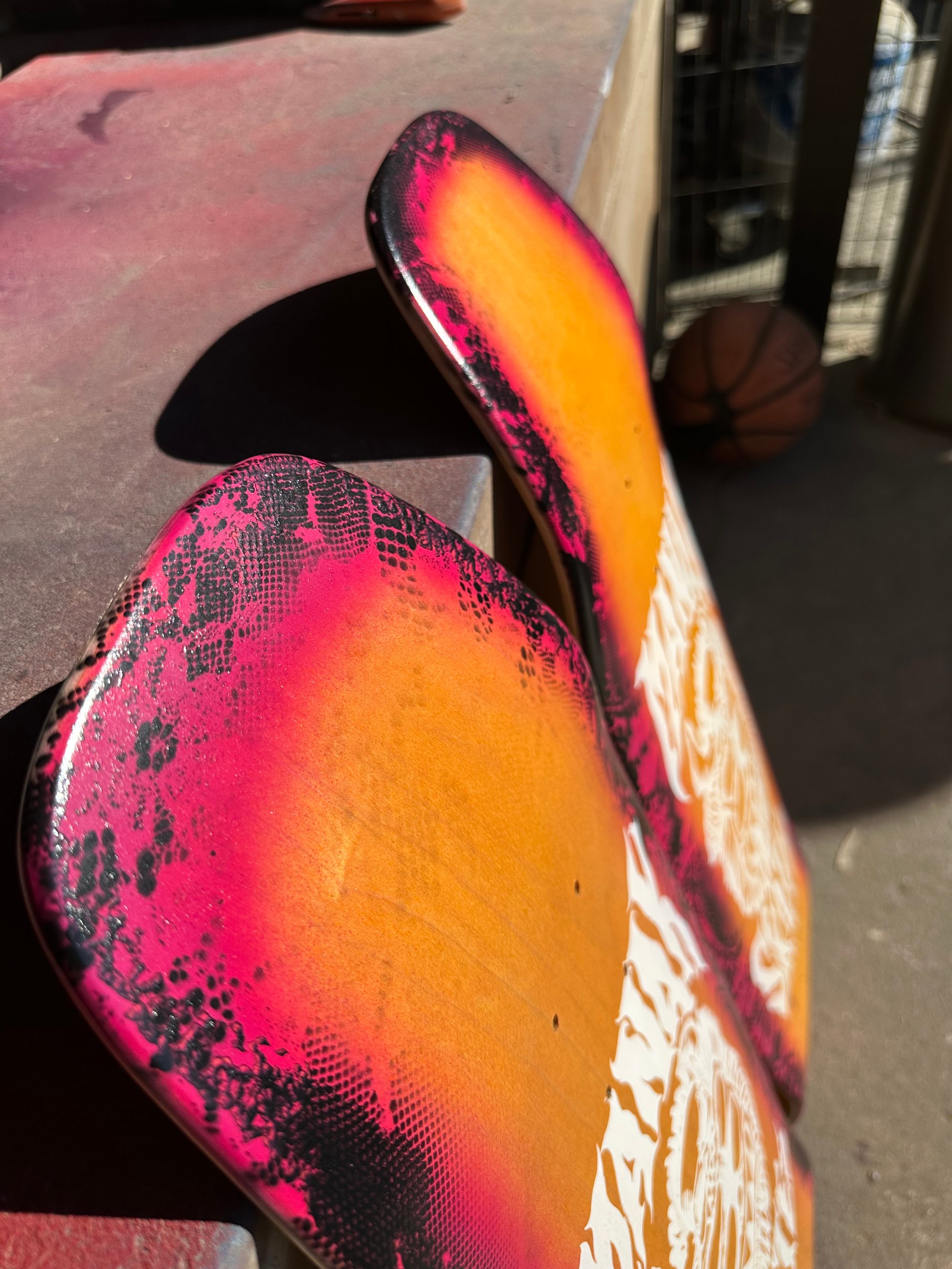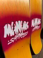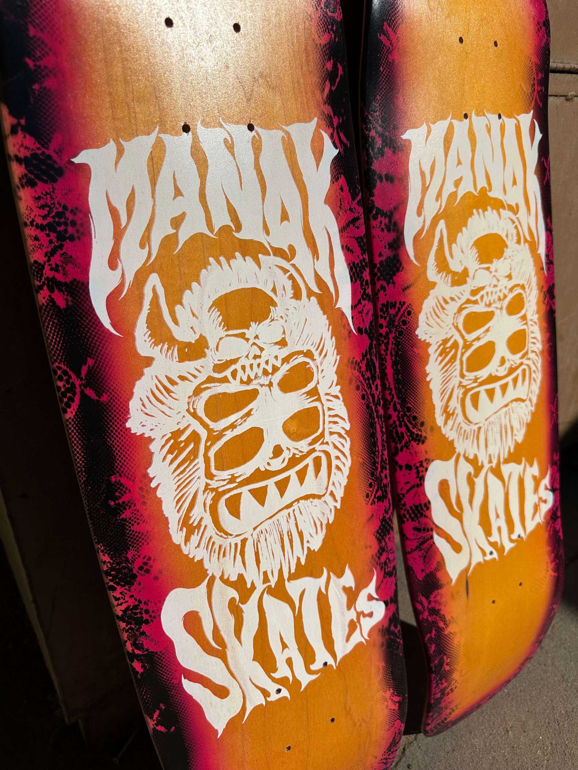 9.125” wide, 32.5” long, 6.375” nose, 7” tail, 15” wheelbase, medium heavy concave. Screen print on the bottom, one color top graphic. Orange dyed veneer on top and bottom. Sprayed halo with floral lace. Medium/Heavy concave. Only two made. All decks are hand glued, cold pressed, shaped, painted, screen-printed, glossed, and shrinkwrapped one at a time by the Manak family in our backyard in San Jose, Ca. We only use the finest North American Hard Rock Maple. We add extra press time and cure times to make a higher quality, better performing deck. Hand-glued leads to a stiffer, longer-lasting board with everlasting pop. In most cases, our boards will last much longer than a factory-made deck. Low tech, no tech! 🤙