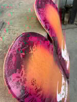 9.2" wide, 33.25” long, 15” wheelbase, 7.” nose and 7” tail. Symmetrical shaped twin tail. Spayed magenta and black Hawaiian Lace Halo, OG Skull screen printed graphic on bottom, logo screen print on top. Two orange dyed veneer on top and bottom. Two made. Medium/heavy concave.