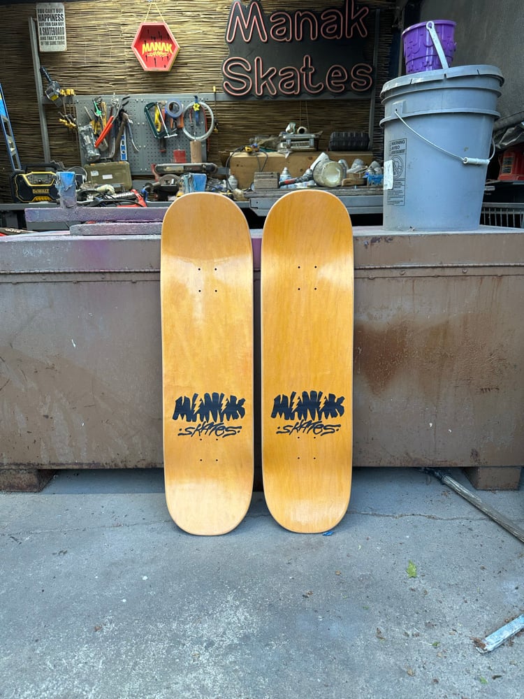 All decks are hand glued, cold pressed, shaped, painted, screen-printed, glossed, and shrink wrapped one at a time by the Manak family in our backyard in San Jose, Ca. We only use the finest North American Hard Rock Maple. We add extra press time and cure times to make a higher quality, better performing deck. Hand-glued leads to a stiffer, longer-lasting board with everlasting pop. In most cases, our boards will last much longer than a factory-made deck. Low tech, no tech! 🤙