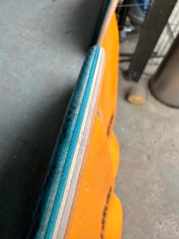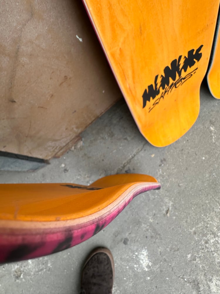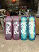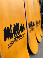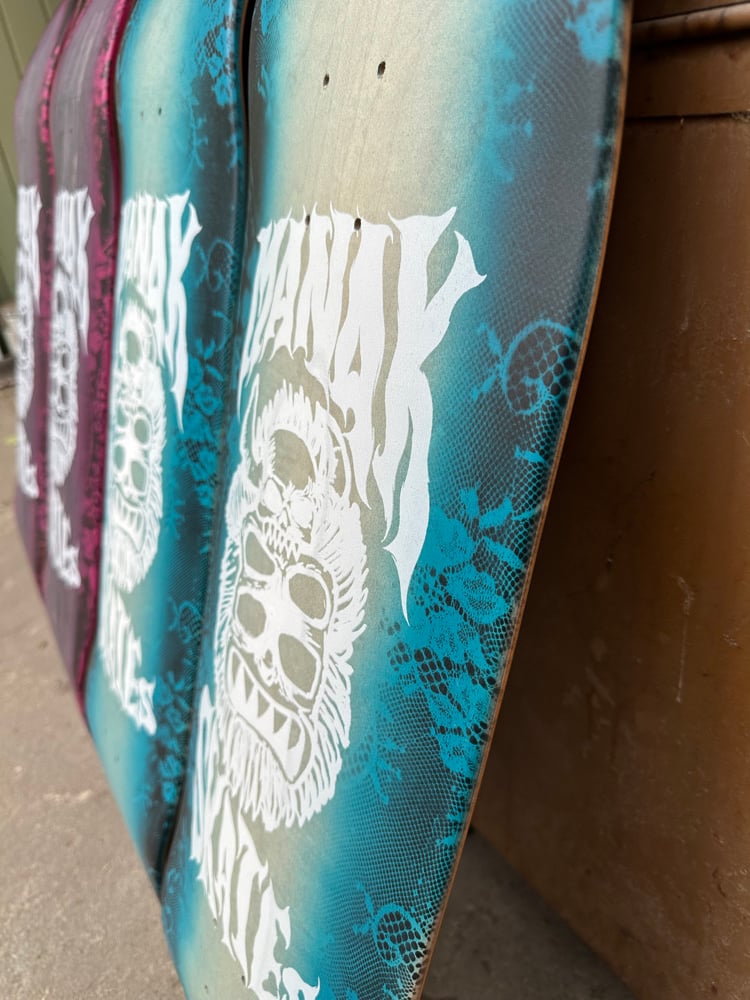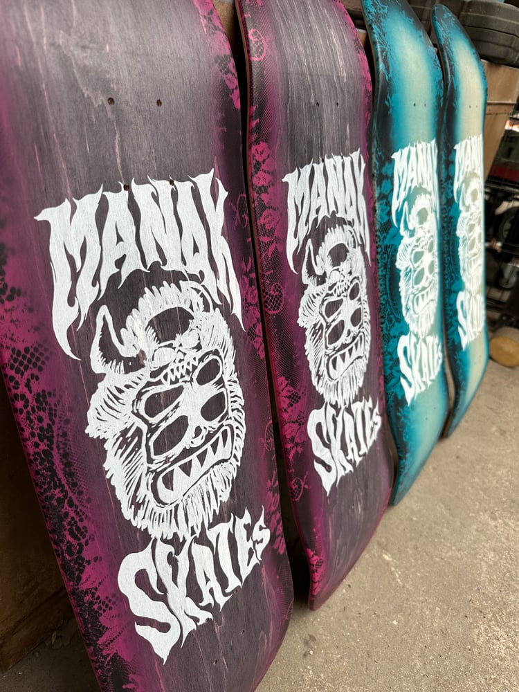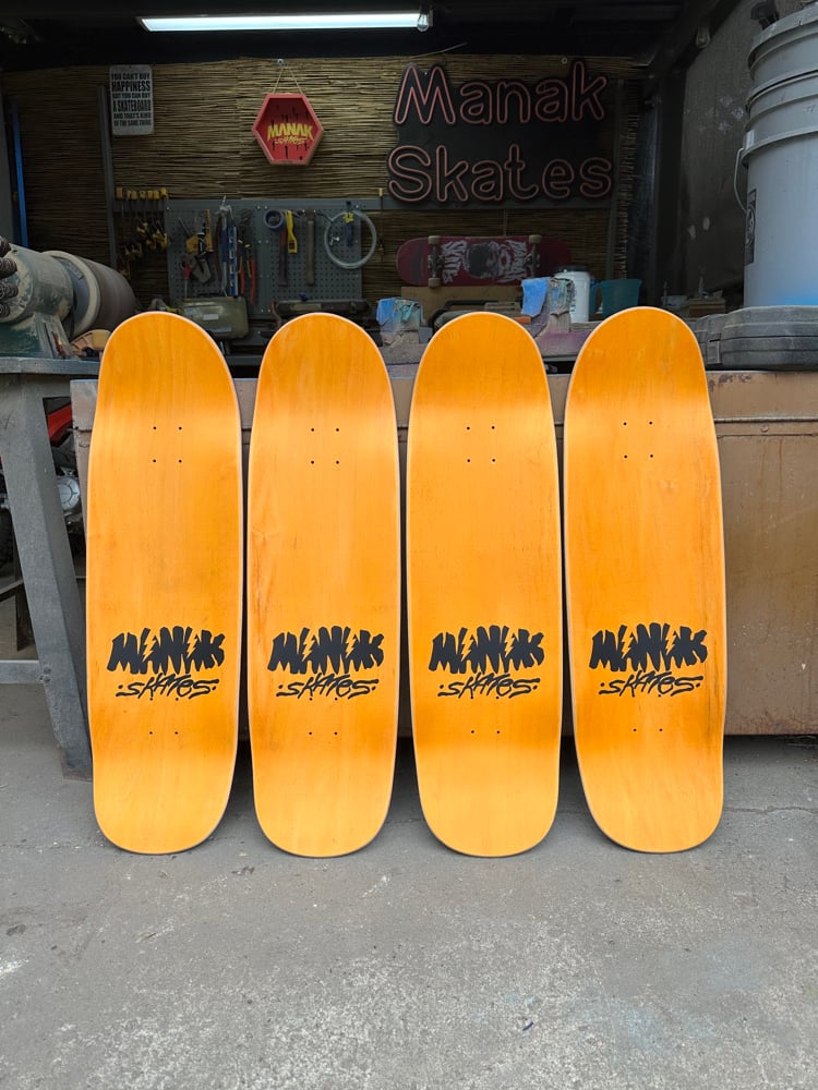 All decks are hand glued, cold pressed, shaped, painted, screen-printed, glossed, and shrink wrapped one at a time by the Manak family in our backyard in San Jose, Ca. We only use the finest North American Hard Rock Maple. We add extra press time and cure times to make a higher quality, better performing deck. Hand-glued leads to a stiffer, longer-lasting board with everlasting pop. In most cases, our boards will last much longer than a factory-made deck. Low tech, no tech! 🤙