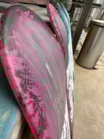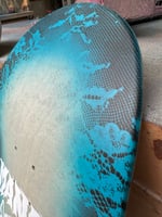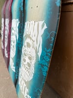 9.875" wide (9.625" over front truck, 9.5" over back truck), 33.5” long, 15.25” wheelbase, 7” nose and 7” tail. This one for the the big kids! Smash some pool coping, rip a vert ramp or cruise around town with your dog pulling you on this badass "Dump Truck". Hand screen-printed, sprayed halo, and sprayed floral lace design.