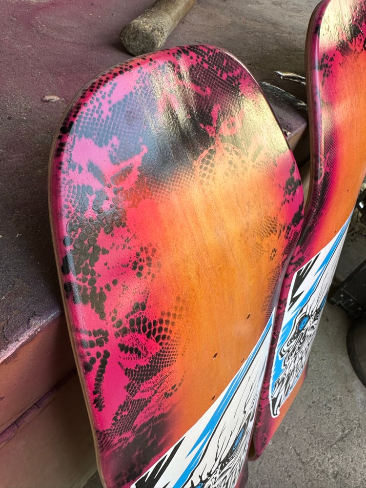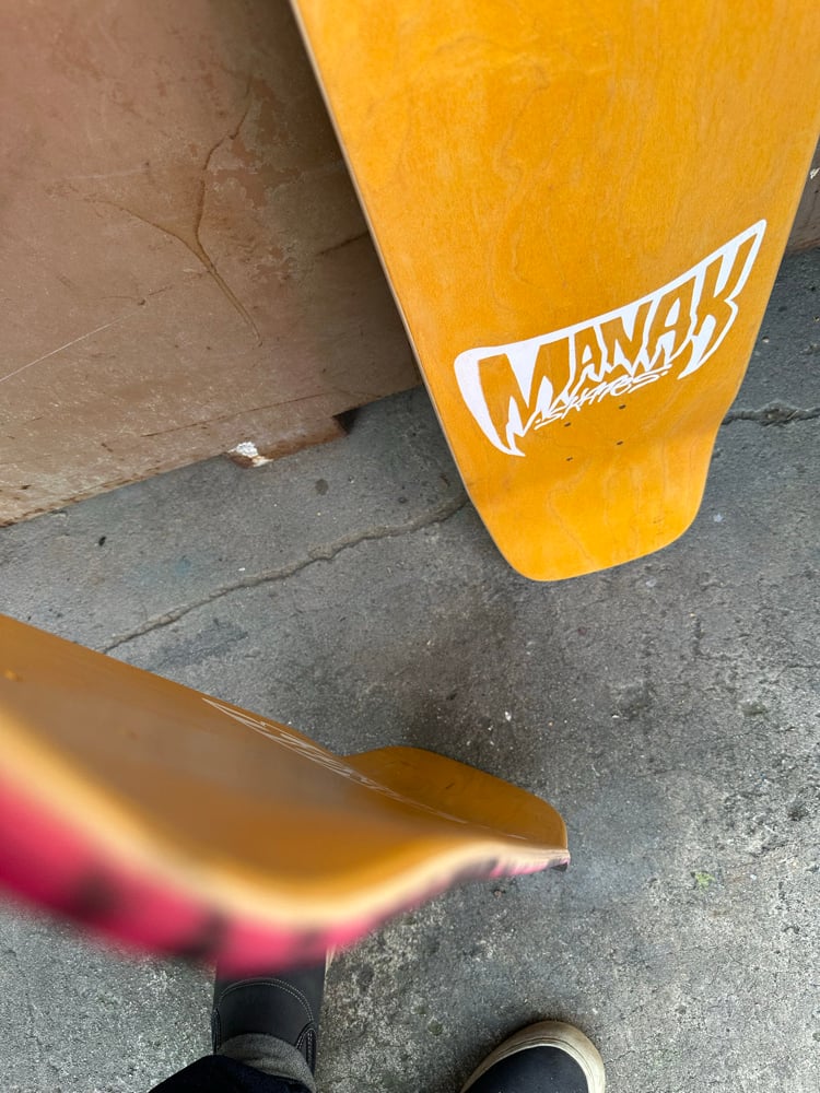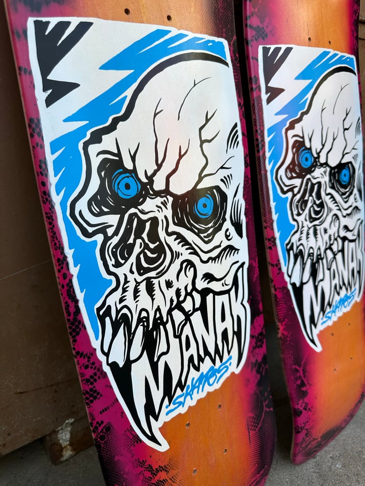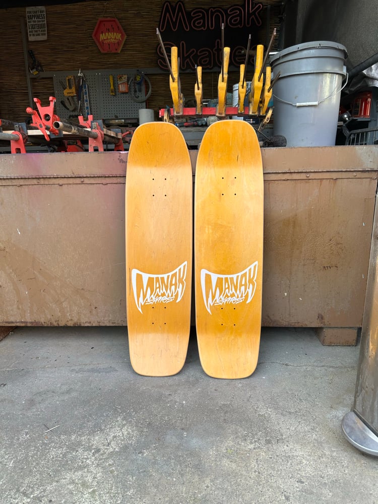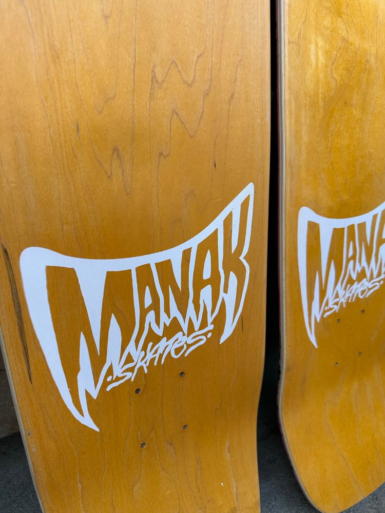 All decks are hand glued, cold pressed, shaped, painted, screen-printed, glossed, and shrink wrapped one at a time by the Manak family in our backyard in San Jose, Ca. We only use the finest North American Hard Rock Maple. We add extra press time and cure times to make a higher quality, better performing deck. Hand-glued leads to a stiffer, longer-lasting board with everlasting pop. In most cases, our boards will last much longer than a factory-made deck. Low tech, no tech! 🤙
