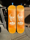 9” wide, 33.125” long, 15” wheelbase, 7.125” nose, 7” tail. Orange sprayed honeycomb accents, screenprinted top and bottom graphics. Two orange dyed veneer on top and bottom. Two made. Medium/heavy concave.
