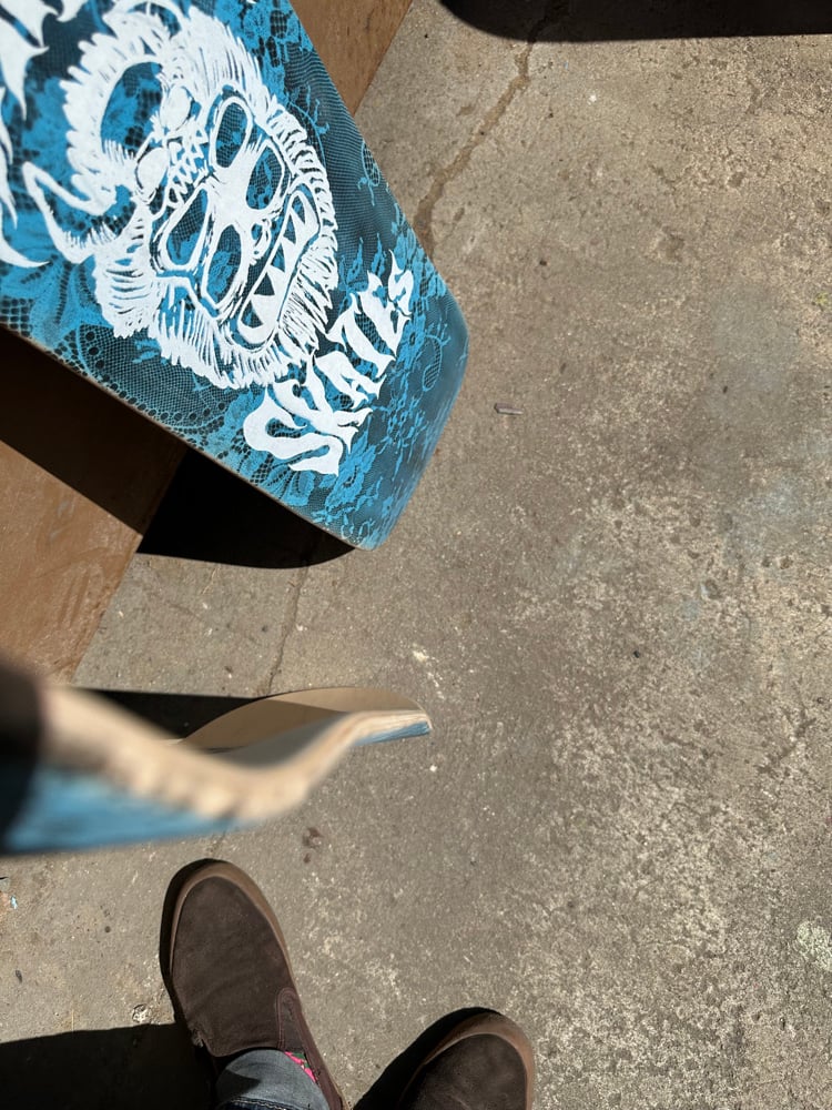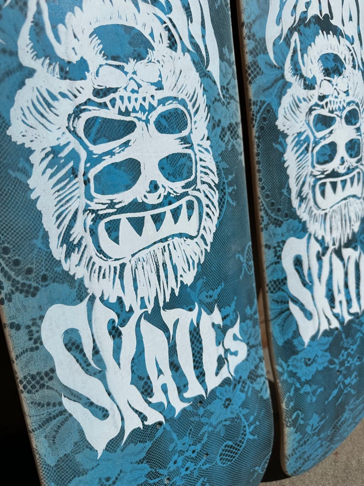 9” wide, 32.625” long, 14.5” wheelbase, 7.125” nose, 6.75” tail. Hand screen printed top and bottom. All natural veneer, painted blue belly with black floral lace accents. 2 made. Medium/Heavy Concave. Don't sleep.