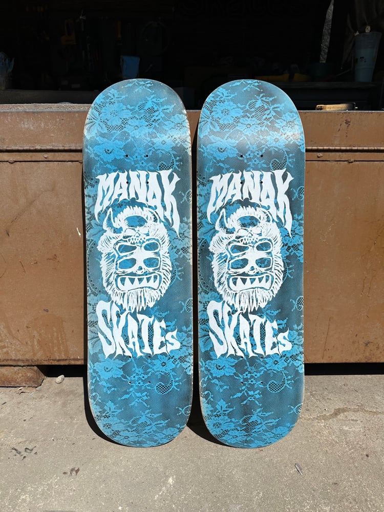 All decks are hand glued, cold pressed, shaped, painted, screen-printed, glossed, and shrink wrapped one at a time by the Manak family in our backyard in San Jose, Ca. We only use the finest North American Hard Rock Maple. We add extra press time and cure times to make a higher quality, better performing deck. Hand-glued leads to a stiffer, longer-lasting board with everlasting pop. In most cases, our boards will last much longer than a factory-made deck. Low tech, no tech! 🤙