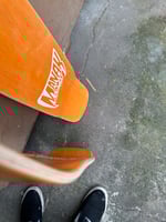 9.25" wide, 33.5" long, 7" tail, 6.75" nose, 15.5" wheelbase. Punk point and lots of tapering and stinger cut-ins near the tail. This is a real style hound. Screen printed graphics on top and bottom. Two orange dyed veneer on top and bottom. Two made. Medium/heavy concave.
