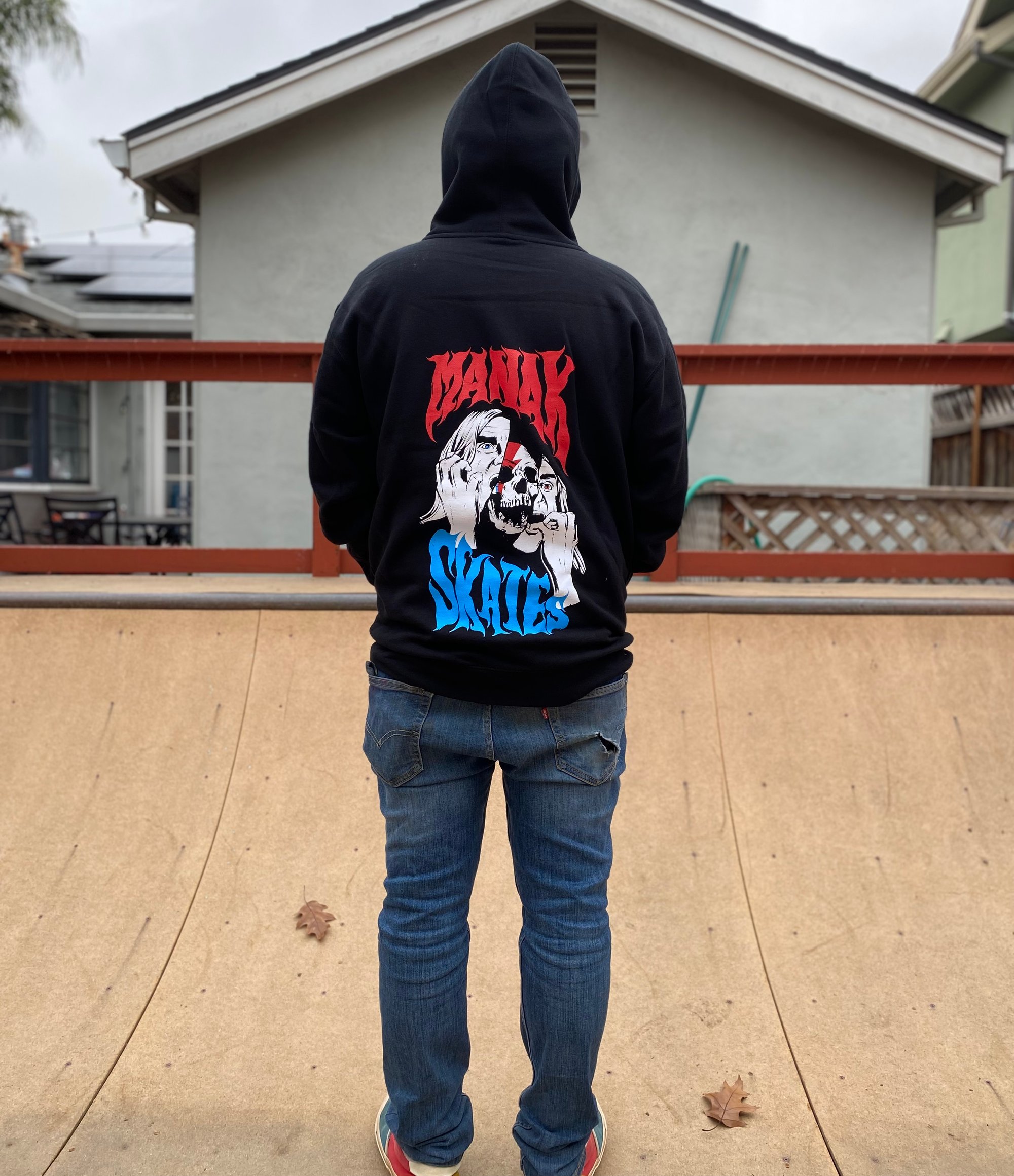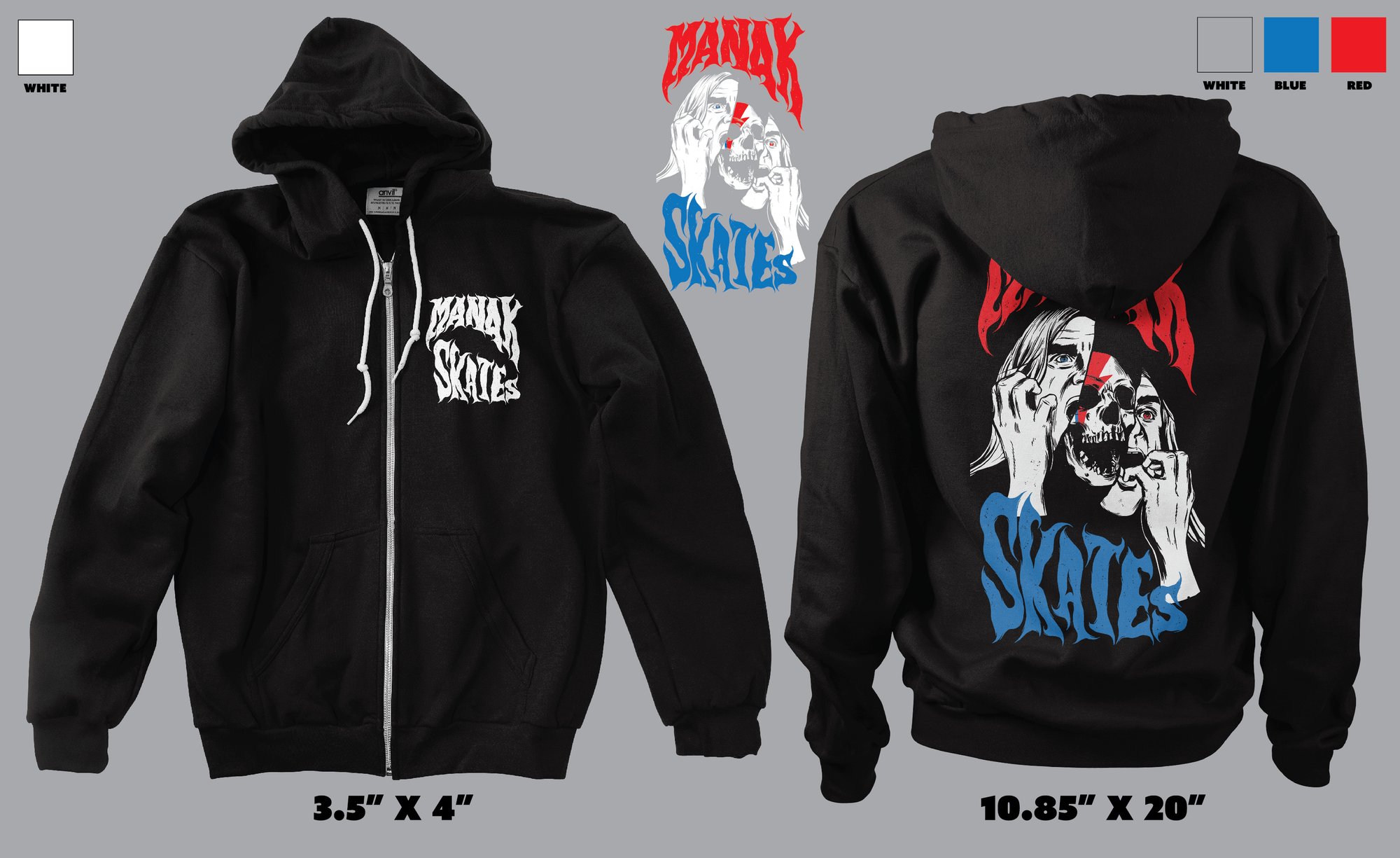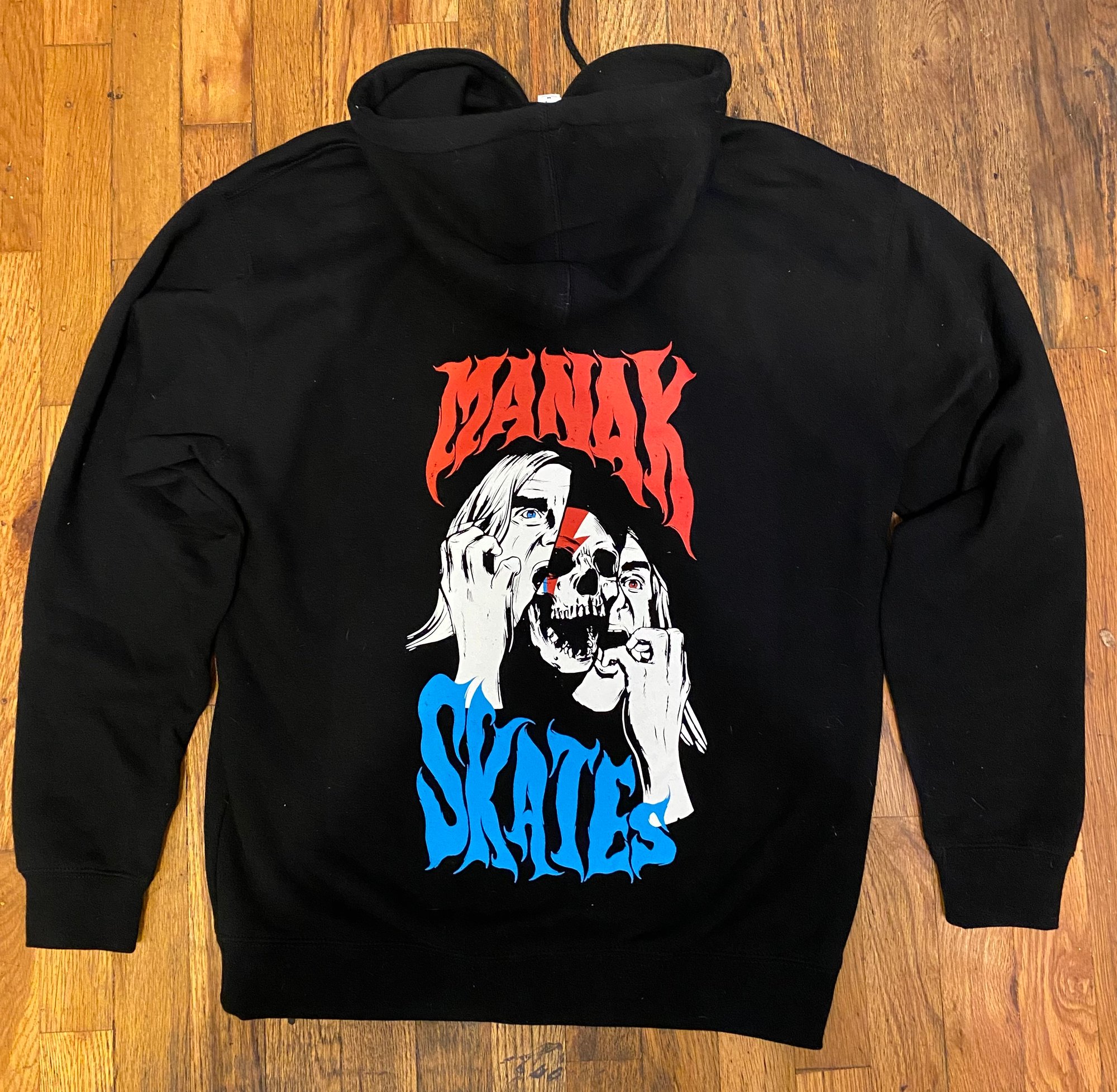 Iggy Stardust 3 color screen print on back, 1 color pocket logo on front. Heavy duty independent trading company brand 70/30 zip hood. Thick, warm and durable black zip up hoody. Art by @dirtybeanie
